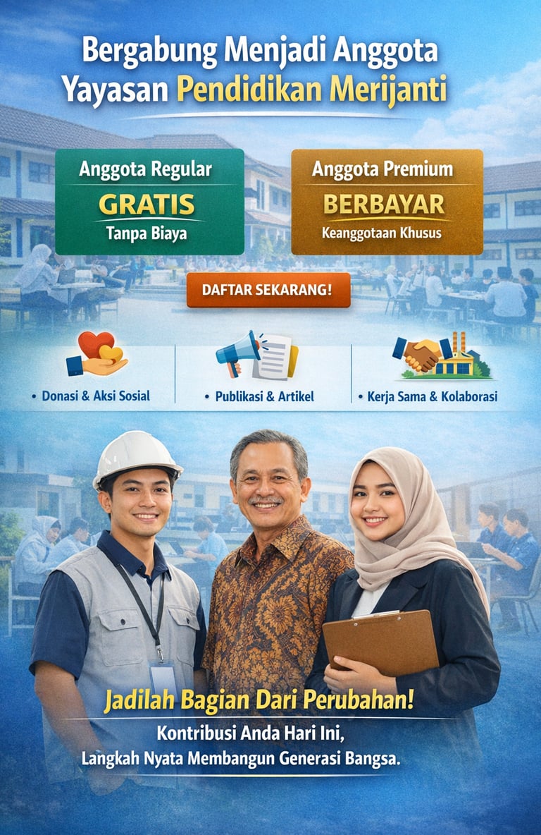 Menjadi anggota Yayasan Pendidikan Merijanti adalah pintu awal untuk berkontribusi langsung dalam memajukan pendidikan kejuruan dan menyiapkan generasi muda yang terampil serta berdaya saing. Keanggotaan tersedia dalam dua pilihan, Anggota Regular yang dapat bergabung tanpa biaya, dan Anggota Premium dengan kontribusi berbayar sebagai dukungan aktif terhadap program yayasan. Setelah terdaftar sebagai anggota, Anda dapat berpartisipasi lebih luas melalui donasi, publikasi gagasan pendidikan, serta kerja sama sebagai trainer, fasilitator, mitra dunia usaha dan industri, maupun bentuk kolaborasi lainnya.
