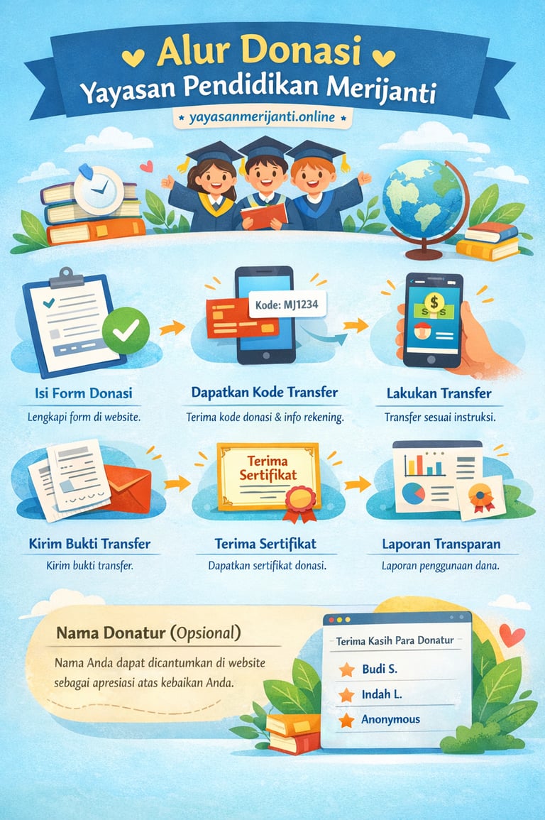 Donasi di Yayasan Pendidikan Merijanti adalah langkah nyata untuk ikut mencerdaskan bangsa melalui pendidikan kejuruan yang relevan dan berdaya saing. Setiap kontribusi yang Anda berikan menjadi bagian dari upaya membangun Sekolah Menengah Kejuruan (SMK) yang menyiapkan generasi muda agar terampil, berkarakter, dan siap menghadapi dunia kerja serta tantangan masa depan. Melalui website Yayasan Merijanti, donatur dapat mengisi form donasi dengan mudah, mencantumkan data diri, nominal kontribusi, serta pilihan pencantuman nama (opsional). Setelah form dikirim, yayasan akan memberikan kode donasi dan informasi rekening transfer untuk memastikan setiap donasi tercatat secara tertib dan transparan. Donasi yang telah ditransfer diverifikasi melalui bukti transfer, kemudian diterbitkan sertifikat donasi resmi sebagai bentuk apresiasi dan pertanggungjawaban. Seluruh dana dikelola secara amanah untuk mendukung pengembangan kompetensi, keterampilan praktis, lingkungan belajar yang inklusif, serta kolaborasi dengan dunia usaha dan industri. Atas persetujuan donatur, nama donatur dapat dicantumkan di website yayasan sebagai simbol kebersamaan dan kepedulian dalam membangun masa depan pendidikan.